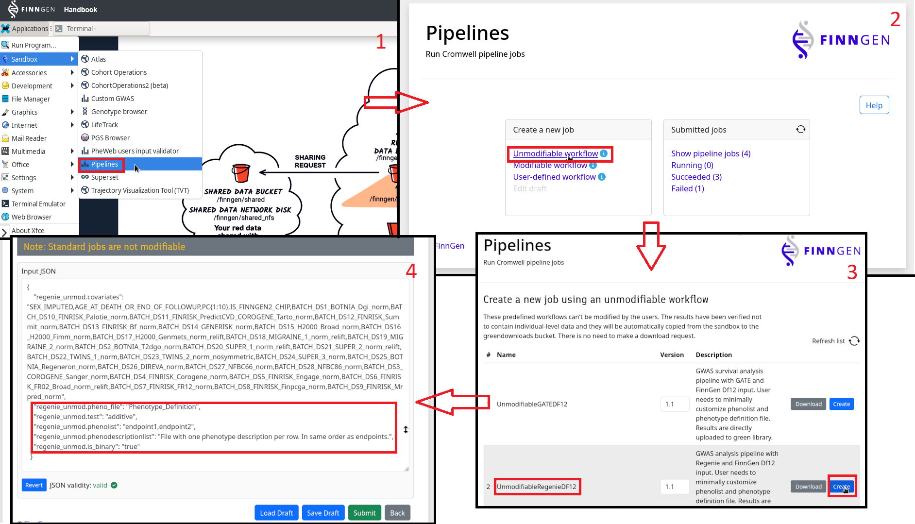 **Fourth**, open the Pipelines tool from the Applications menu in your sandbox VM, and then select "Unmodifiable workflow" from the "Create a new job" menu, find "UnmodifiableRegenieDF12" and select "Create", then scroll down to the "Input JSON" and edit the options (see below). See Fig. 1 for a visual demonstration of the process.