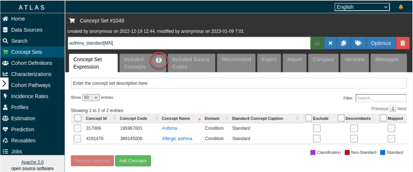 Only two concepts are currently selected (see the number 2 in the Included Concepts tab)