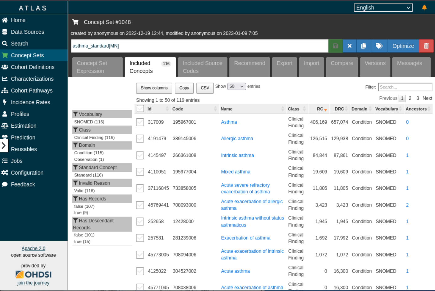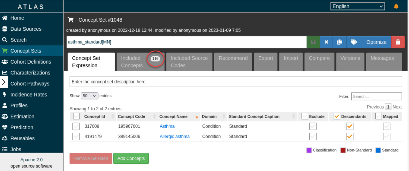 After selecting the descendants for both standard codes, we have now selected 116 concepts (see the number 116 in the Included Concepts tab):