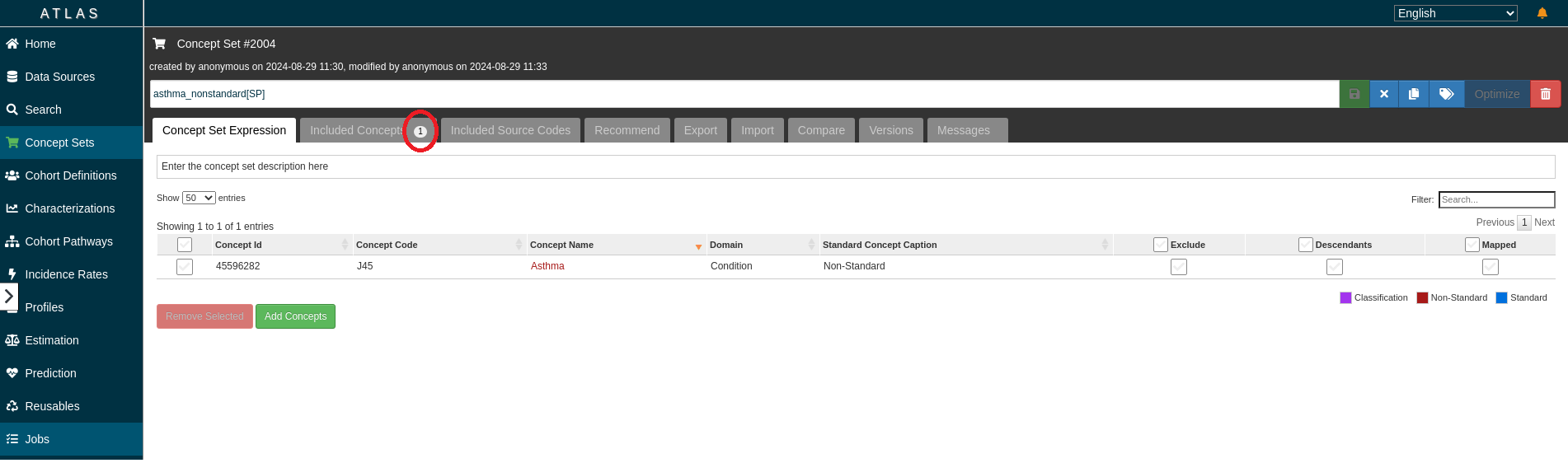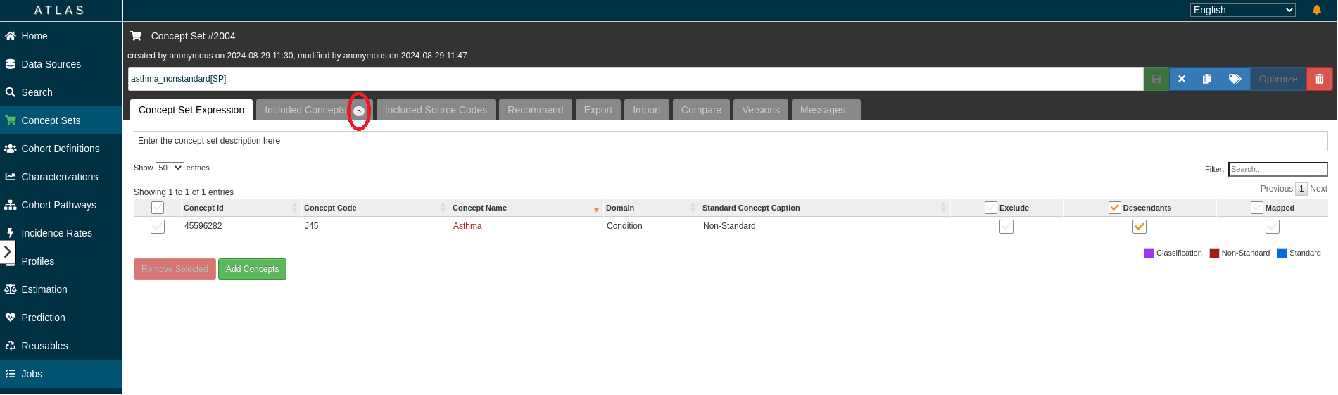In Atlas, both standard codes and some non-standard codes are grouped into hierarchies. You can define a Concept Set using the descendants of standard and some non-standard codes. If you are using non-standard codes with no hierarchies, you must first find equivalent standard codes, because non-standard codes that are not grouped into hierarchies will not have descendants.