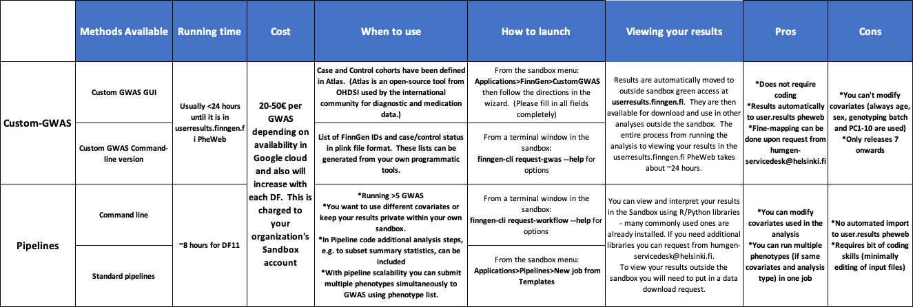We provide a number of methods that enable you to run GWAS for your custom endpoint(s). This table describes the trade-offs of different methods. All methods use [REGENIE](https://docs.finngen.fi/working-in-the-sandbox/running-analyses-in-sandbox/how-to-run-genome-wide-association-studies-gwas/how-to-run-gwas-using-regenie). There are also instructions to use [SAIGE](https://docs.finngen.fi/working-in-the-sandbox/running-analyses-in-sandbox/how-to-run-genome-wide-association-studies-gwas/how-to-run-gwas-using-saige) available, but since DF7 we have moved to use REGENIE, and SAIGE has not been supported similarly since.