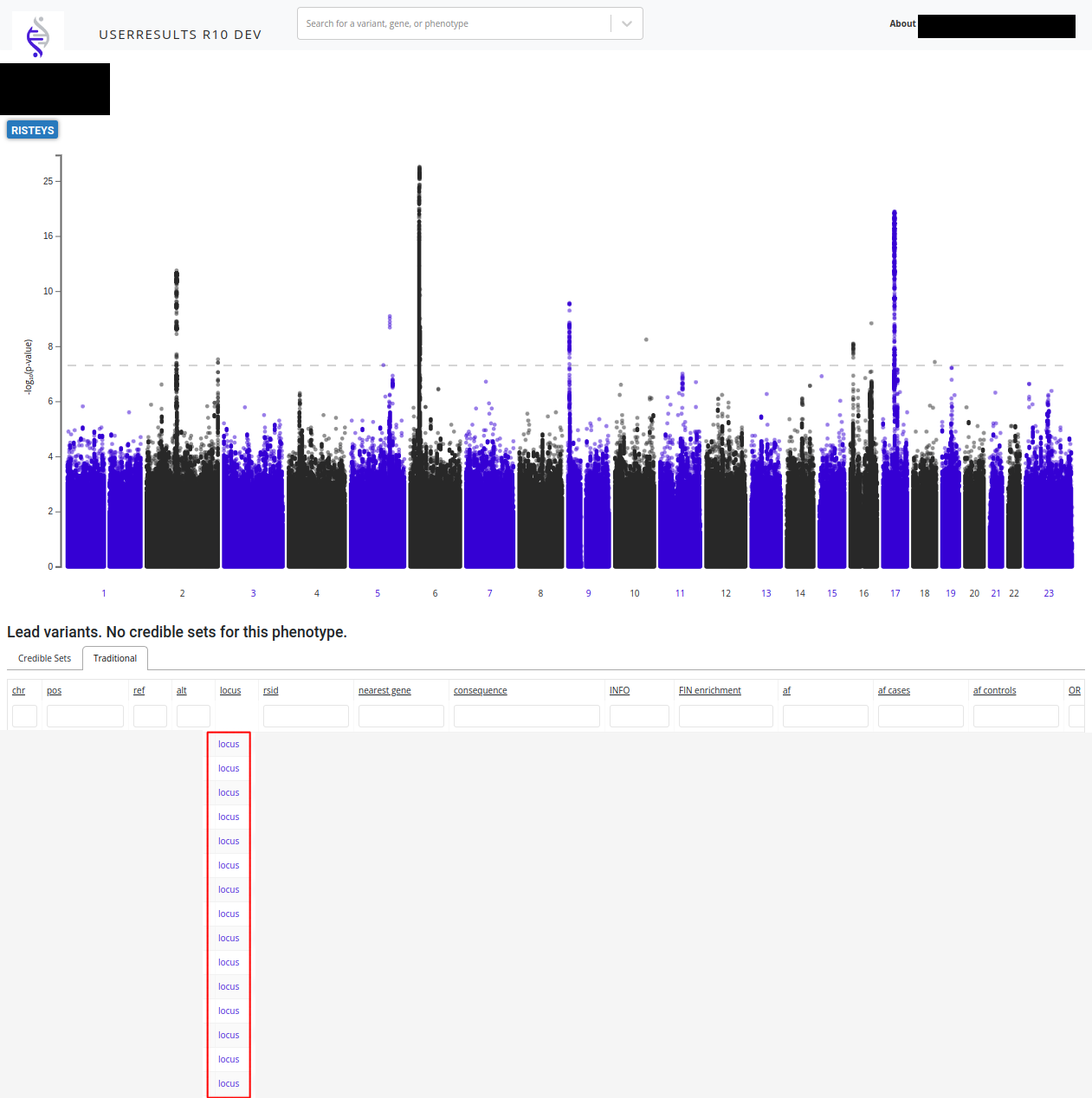 You can get to individual regions to by first going to your endpoint in userresults browser, and then either clicking on a GWAS peak in the manhattan plot, or on the 'locus' link in the table, like in the below image.