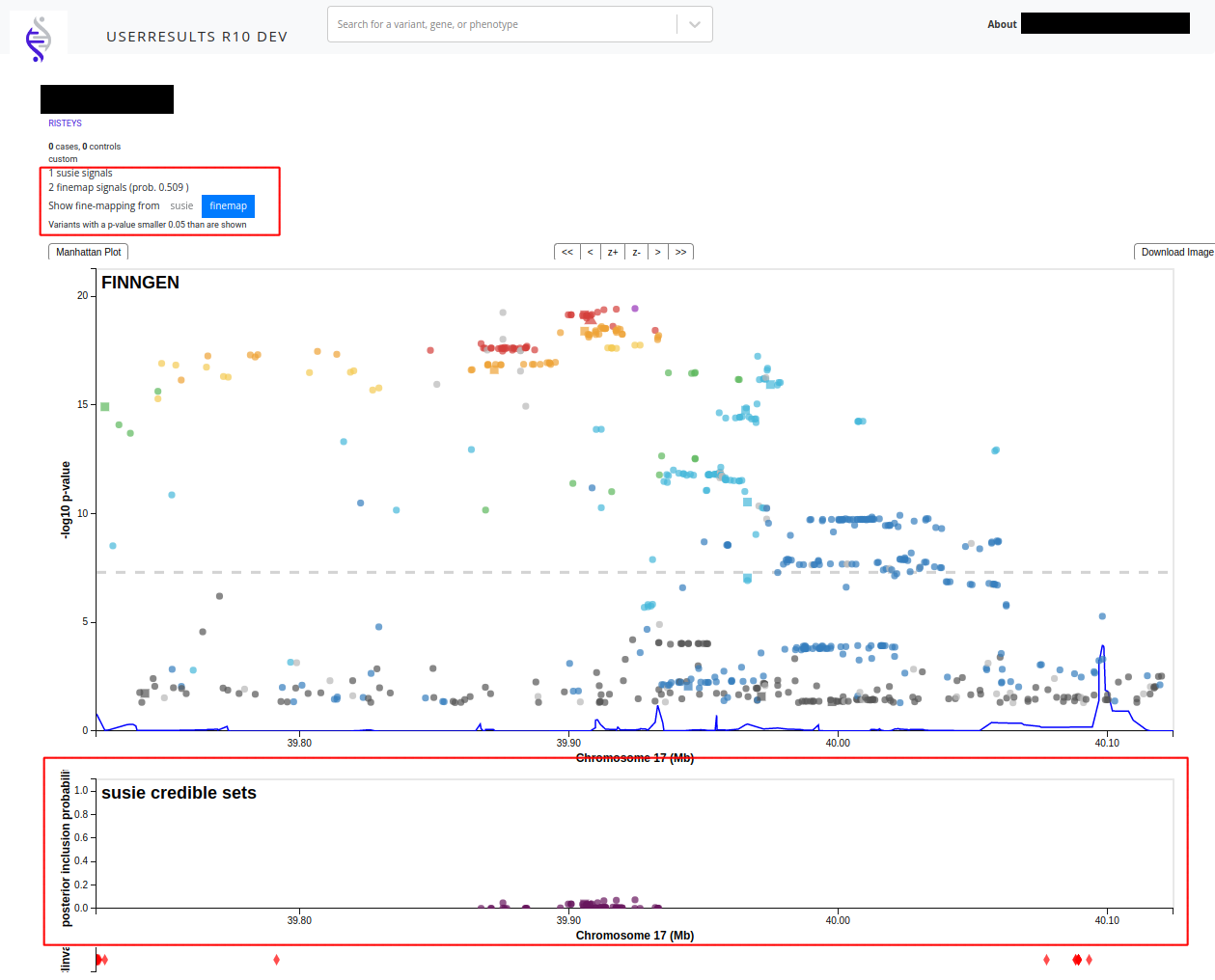 In the region view, the credible set data should show as both a listing of how many signals were found on both SuSiE and FINEMAP, as well as a locuszoom plot. These have been highlighted with red in the image below.