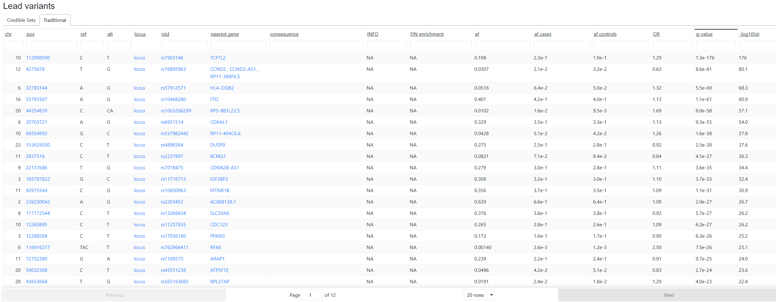 Scrolling further, you will also be able to see the Manhattan plot in a tabular format, distinguished by either the **traditional GWAS hits** or based on a [**credible set**](https://docs.finngen.fi/background-reading/finemapping).