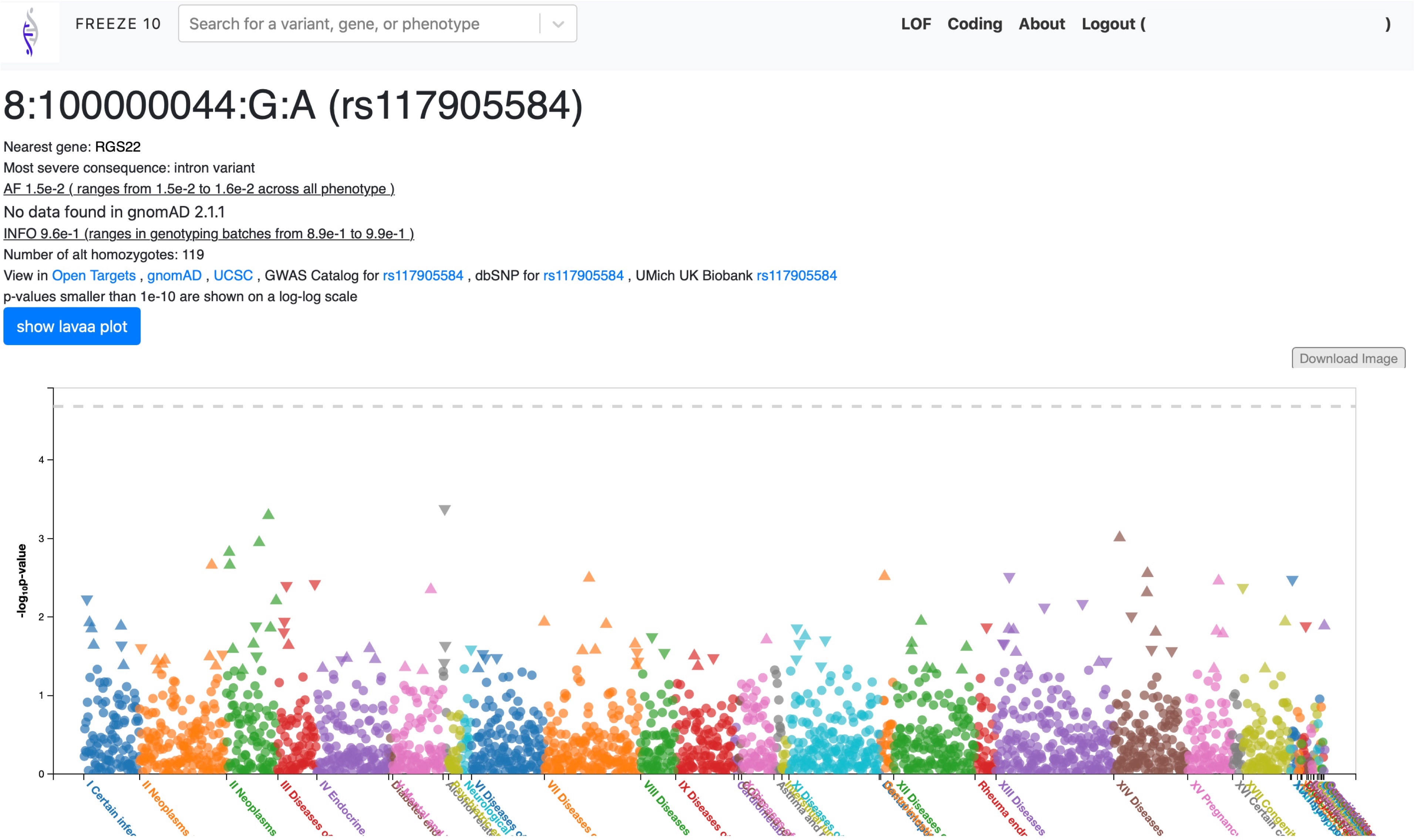 To see the corresponding [LAVAA plot](https://docs.finngen.fi/working-outside-the-sandbox/link-to-how-to-use-pheweb/volcano-plots-with-lavaa), you can click `show lavaa plot` on top of the manhattan plot.