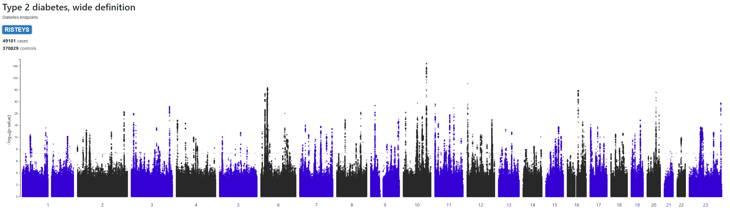Upon clicking an endpoint, you will then be directed to the endpoint's page which will contain information such as case-control numbers and results from the association scan of the endpoint. In the following screenshot, we show the endpoint results for “*Type 2 diabetes, wide definition*”.