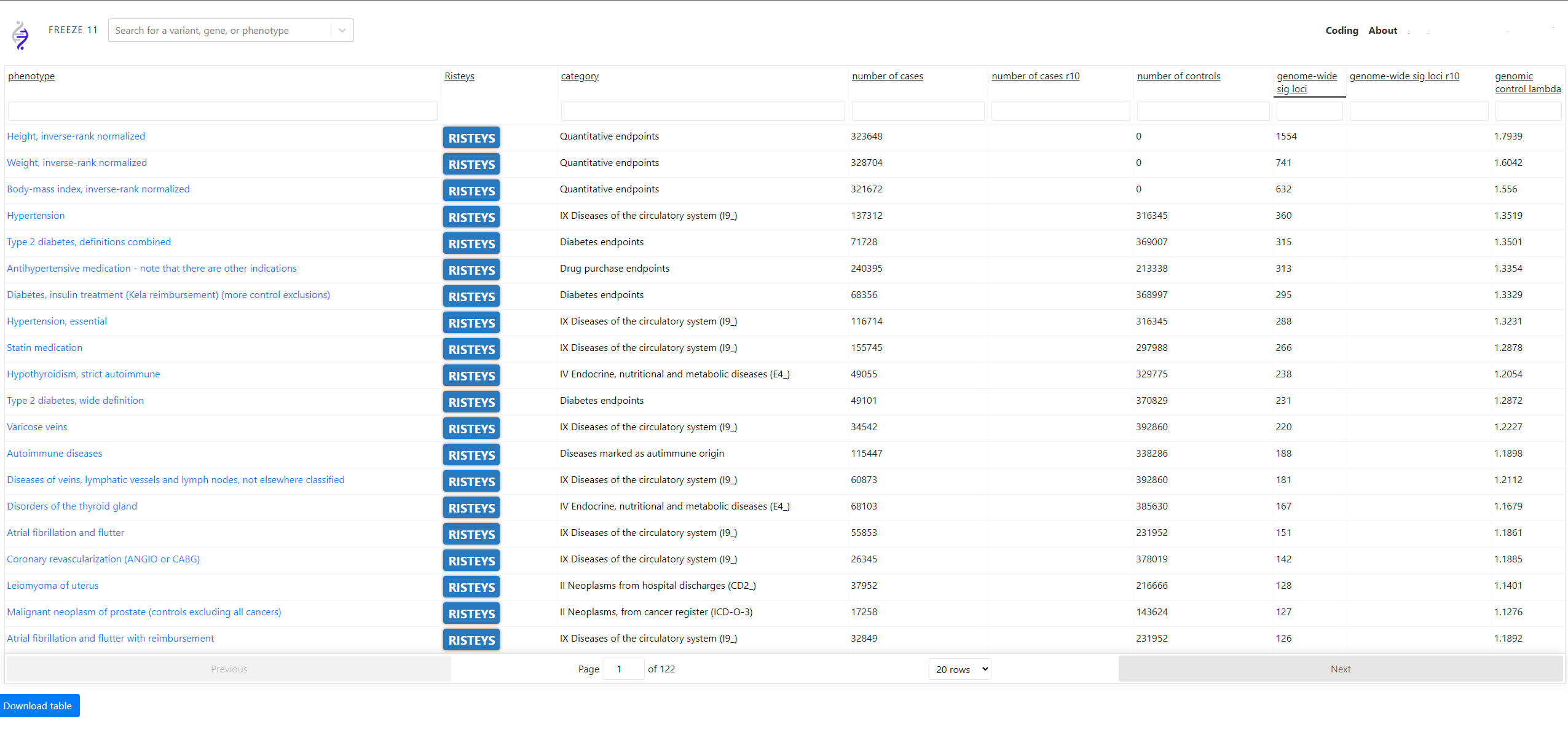 From home page in Pheweb, you can also go directly to [LOF burden test results browser](http://r10.finngen.fi/lof), or [coding variant browser](https://docs.finngen.fi/working-outside-the-sandbox/coding-variant-browser) by clicking the icons 'LOF' and 'Coding' in the top right corner, respectively.